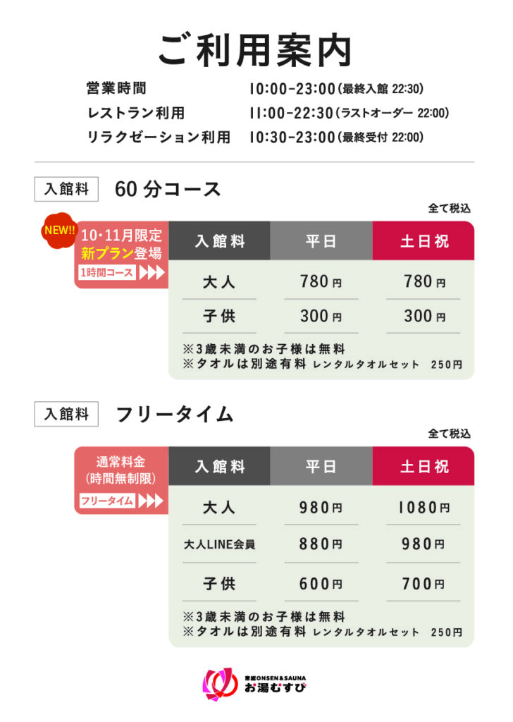 1Fエリアをお得にご利用できる60分制のコース(大人780円/子供300円[税込])を開始しました。