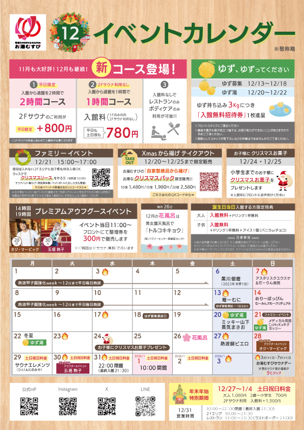 ・「1時間コース」や「2Fサウナ込2時間コース」は好評につきそのまま継続