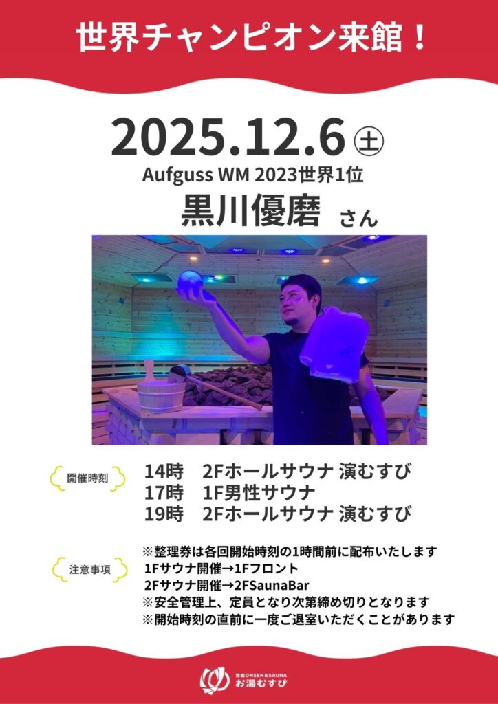 12/6土曜には、アウフグース世界大会2023年優勝の黒川さんが来訪し、当館にてアウフグース実演が開催されます🔥
