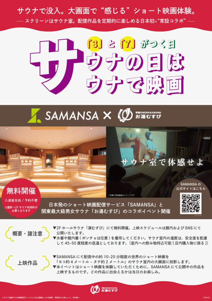 1月から新企画として、「お湯むすびサウナデー」でショート映画配信サービス”SAMANSA”とコラボイベントを定期開催します。