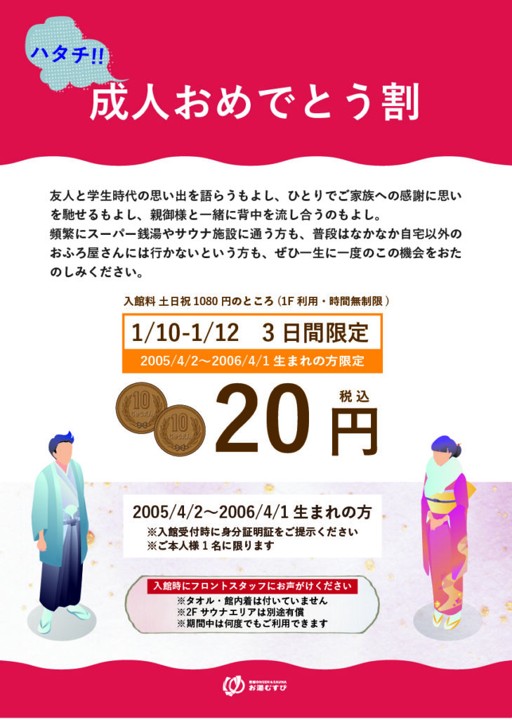 1月12日の国民の祝日「成人の日」に合わせて20歳向けのキャンペーンを行います。
